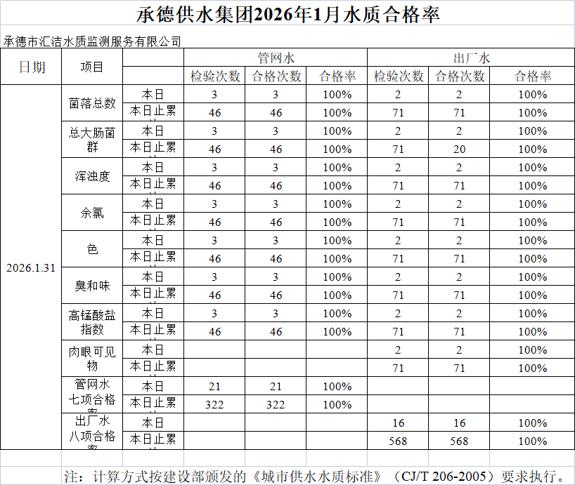 承德供水集團(tuán)2026年1月31日水質(zhì)合格率
