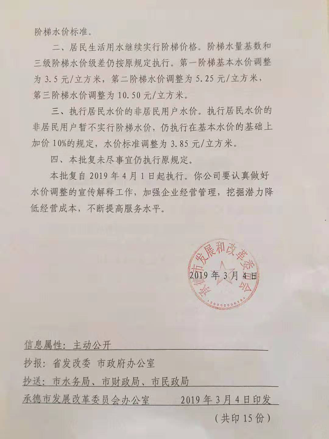 承德市發(fā)展和改革委員會(huì)關(guān)于調(diào)整雙橋區(qū)高新區(qū)供水價(jià)格的批復(fù) 承發(fā)改價(jià)格【2019】59號(hào)